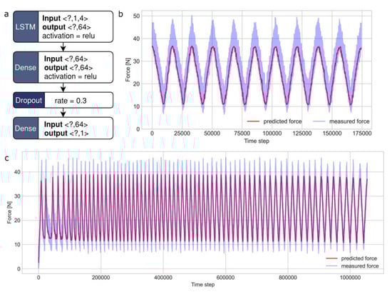 The time-series data, namely the force and temperature data points indexed in time, reflect the material-actuator performance during multi-cyclic operation. The task of predicting the future performance of the material-actuator may be solved as a supervised machine learning problem: at time , predict the material-actuator’s future force output (i.e., time steps later), given a sequence of material-actuator temperatures , the environment temperatures , the material-actuator’s raw force values , 2.5-second-window rolling-average force values , and PWM input at times . As the force is changing relative slowly, we chose to predict the force output at 20 s in the future (), in which the root-mean-squared error (RMSE) between and is 5.0 N. As shown in Figure 6a, we used a long short-term memory neural network model (LSTM) to predict the force . The first layer of the model has 64 LSTM cells, which are connected to a dense layer with ReLU activation, a dropout layer, and a final dense layer. The mean squared error (MSE) was used as a loss function. For comparison, a baseline model was trained by replacing the LSTM layer with a dense layer (ReLU activation) of 64 cells. A much simpler linear regression model was also trained. The models are shown in detail in Figure A6.