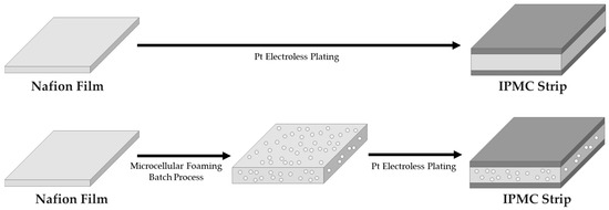 Ionic polymer–metal composite (IPMC) strip prepared by microcellular foaming process of Nafion, which is the polymer electrolyte of this study.