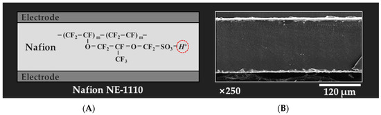 To derive the foaming ratio of the foamed Nafion, the density of the specimen (MD-300S, ALFA MIRAGE Co., Ltd., Osaka, Japan) was measured, and the foaming ratio was calculated using Equation (1), where d0 is the density of the non-foamed solid specimen, and d1 is the density of the microcellular foamed specimen.