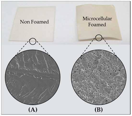Comparison of appearance and cross section of (A) non-foamed and (B) microcellular foamed Nafion specimens.