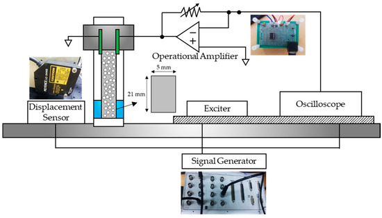 The detailed experimental process is shown in Figure 6; the upper part of the IPMC specimen is fixed with the electrode, and the lower part is excited by changing the frequency to a predetermined signal using an exciter (Product No. Mini-shaker Type 4810, Brüel & Kjær Inc., Copenhagen, Denmark). The generated current value is increased using an operational amplifier (op-amp) to increase the harvest width. Moreover, the voltage drop was compensated by a power amplifier to provide a signal from the signal generator (Model No. DS1104 RTI, dSPACE Inc., Wixom, MI, USA) and obtain the desired type of movement. To simulate the uniform external force on each specimen, the experimental conditions were selected depending on the magnitude of the voltage applied to the exciter. The signal generator is a device that stores digital signals as analog signals or transforms analog signals into digital signals. A displacement sensor was installed to observe the actual movement during excitation, and its signal was received by an oscilloscope.