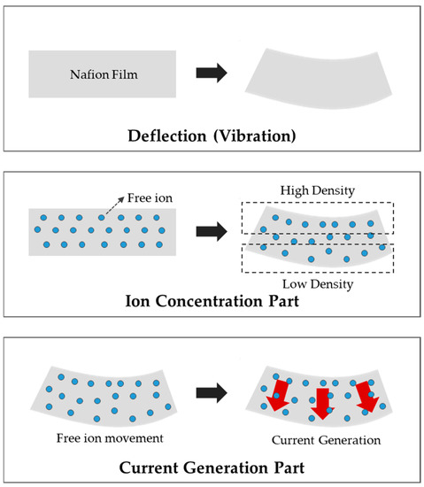 In this study, we considered the change in radio wave or electrical signal by using the piezoelectric effect described above and morphological changes inside the polymer. Moreover, ionic electro-active polymer (EAP), which has various advantages such as excellent workability, lightweight, fast response speed, and low applied voltage was used as a piezoelectric material, which is a polymer material that generates an electrical response to mechanical vibration or deformation. It has the advantage of higher energy conversion efficiency than conventional energy conversion elements. When an external voltage is applied to an ionic electroactive polymer, the polymer contracts and expands owing to ionic movement and diffusion [1,2,3,4,5,6]. Since it has an energy density of up to approximately 10 times higher than that of conventional energy conversion elements, it is used in most energy harvesting technologies as the next-generation intelligent material. For this reason, it has been attracting a lot of attention recently. EAPs convert mechanical energy to electrical energy by its internal changes, and receives electrical energy and shows mechanical movements outside. Early studies were focused on obtaining the driving force by converting it into mechanical energy using electrical energy. This can be achieved by the reverse piezoelectric effect. These studies mainly investigated driving displacement, driving force, and response speed. However, recently, owing to the emergence of energy harvesting technology, the possibility of developing a generator is being explored and application studies on it have been published [7,8,9,10,11,12,13,14,15,16,17]. Ionic polymer–metal composite (IPMC), which is a type of EAP, has been studied as the next-generation actuator and sensor. It is the most intelligent material closest to commercialization, owing to the large displacement it can produce, and the potential to be used at low voltages. Previously, studies related to IPMC energy harvesting changed the plating conditions on the outside and the experimental conditions for the counter ion inside, but some researchers conducted studies to improve the harvesting efficiency through a method of fundamentally changing the shape of the polymer electrolyte membrane.