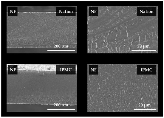 Scanning electron microscope observation images of cross sections of non-foamed Nafion and IPMC specimens.