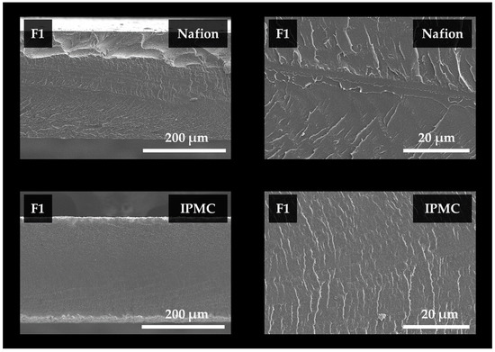 Scanning electron microscope observation image of the cross section of Nafion and IPMC specimens, according to the F1 foaming condition.