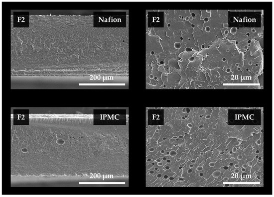 Scanning electron microscope observation image of the cross section of Nafion and IPMC specimens, according to the F2 foaming condition.
