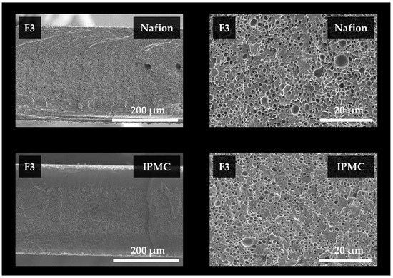 Scanning electron microscope observation image of the cross section of Nafion and IPMC specimens, according to the F3 foaming condition.
