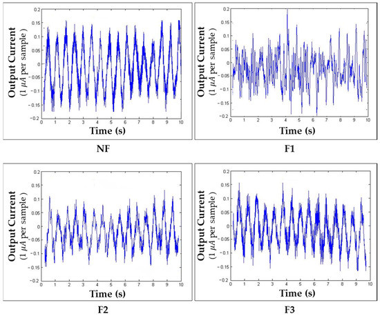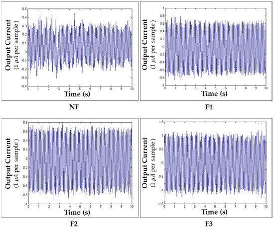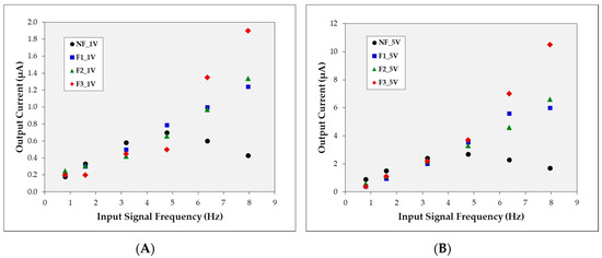 Comparison of output current corresponding to time: (A) NF and F2 (1.6 Hz, 1 V); (B) NF and F3 (8 Hz, 1 V).