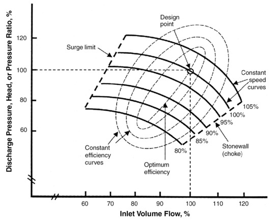 This map provides all possible operating points of a compressor in terms of mass flow rate, pressure ratio, and rotational speed. Moreover, it also indicates the border between stable and unstable regions of compressor operation, referred to as the surge line. When the flow is reduced below the surge limit, the pressure at the discharge of the compressor exceeds the pressure generation capability of the compressor, causing a momentary reversal of flow. When this flow reversal occurs, the pressure of the discharge system is reduced, allowing the compressor to resume delivering flow until the discharge pressure again increases, and this surge cycle repeats. Prolonged operation in this unstable mode can cause serious mechanical damage to the compressor.