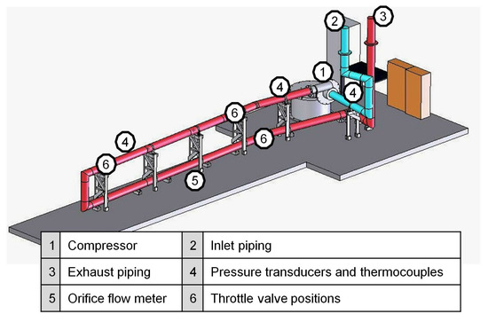The compression system consists of three main components, the centrifugal compressor, the modular ducting system, and the throttle valve. The location of each component installed in the system is illustrated in Figure 5.