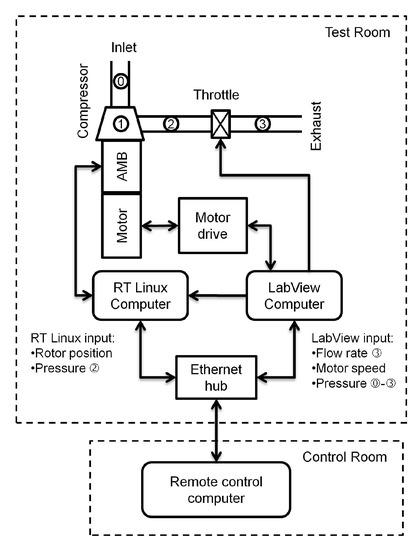 Pressure transducers, thermocouples, and orifice flow meters are installed in the compression system in order to measure the pressure, temperature, and mass flow rate, respectively. The locations of these sensors can be found in Figure 5. These measurements will be used to generate the compressor characteristic curve as well as to provide information for the surge controller. Additionally, the compressor is driven by an induction motor with an output power of 125 kW at the maximum speed of 29,680 rpm. Due to the high power density of the motor, a cooling system is required when operating continuously at high speeds. Therefore, a chiller is installed to circulate the refrigerant fluid in the cooling system of the motor. In addition, rotor suspension and surge control algorithms are implemented by the computer operating on a real-time RTLinux operating system, with a sampling rate of 5 kHz. Input signals to the control computer include rotor position measurements from sensors and the plenum pressure rise measurement, which are sampled at the same time interval. The temperature and flow measurements are collected by the Labview data acquisition system, which is used to operate the motor drive and throttle valve as well. For the user’s safety, these two computers can be controlled remotely from a control room separated from the compressor test rig. The layout drawing of the control/data-acquisition system is illustrated in Figure 6.