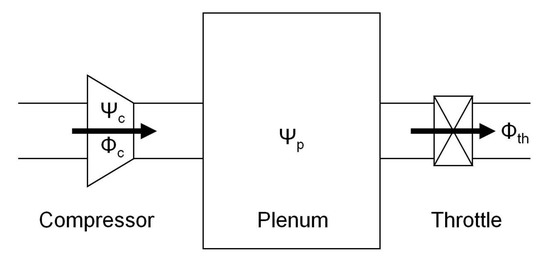 To design the surge controller, a model that describes the flow instabilities in the compression system is required. The well-known, one-dimensional compression model was derived by Greitzer in [11]. Greitzer’s model describes the flow of fluid through the compressor, the plenum volume, and the throttle valve, as shown in Figure 7. The nondimensional states of the compression system are the compressor mass flow rate , the compressor pressure rise , the plenum pressure rise , and the throttle mass flow rate .