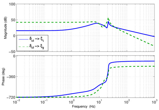 According to the linearized compression system in Equations (3a) and (3b), the system input is the impeller tip clearance and the two outputs are the compressor mass flow rate and the plenum pressure rise . For the throttle valve opening value greater than 0.185, the compression system remains stable in the neighborhood of the equilibrium operating point. In order to capture the instability dynamics during a surge condition, the equilibrium value of the throttle valve opening was chosen to be 0.17 for linearization. For the compression system model linearized at , the frequency responses from the impeller tip clearance to two outputs, and , are shown in Figure 9. From the Bode plots, it can be noticed that there are two resonances that occur at around 7 Hz and 21 Hz, which correspond to the frequencies of the surge limit cycle and the acoustic resonance of piping.