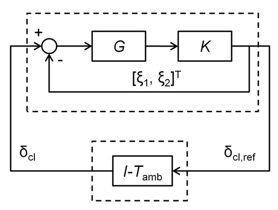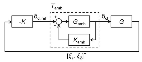 The objective in the surge control design is to stabilize the compression system in the surge condition, where the equilibrium operating point (, ) is beyond the surge line limit. As shown in Figure 10, the two inputs of the surge controller K from the compression system G are the compressor mass flow rate and the plenum pressure rise . The controller output is the reference impeller tip clearance , which is fed into the closed-loop thrust AMB system [10]. The thrust AMB controller will track the desired tip clearance specified by the surge controller in order to induce an appropriate amount of pressure rise for surge stabilization. In the actual implementation, it is impossible to have perfect tracking by the thrust AMB due to external disturbances. This means that the performance of the surge controller will be degraded. Due to this limitation, the surge control design must take into account disturbances, which can impact the interaction between the surge and thrust AMB controllers. Moreover, Yoon et al. suggested in [9] that the closed-loop system shown in Figure 10 can be restructured as shown in Figure 11. This way, the closed-loop dynamics of the compression system and the rotor/thrust AMB system are separated.