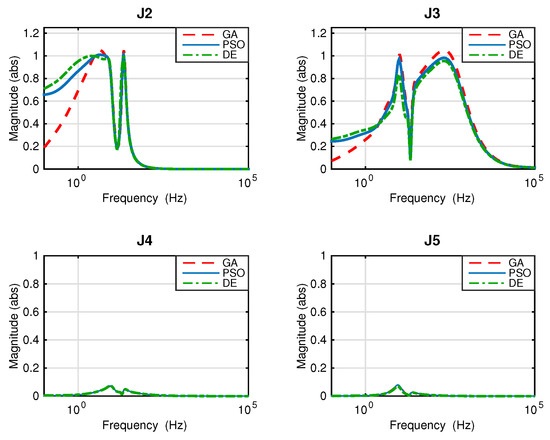 Magnitudes of objective transfer functions resulting from three different tuning methods (GA, DE, and PSO).