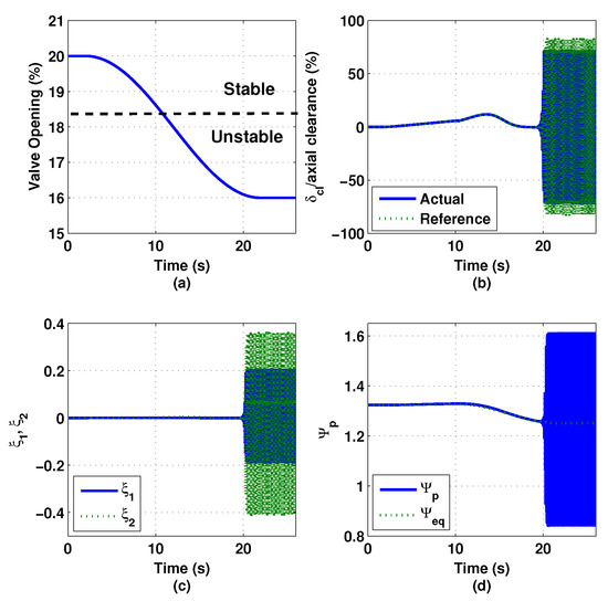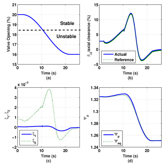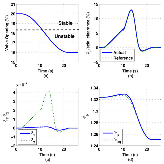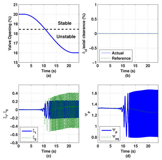With the derived surge controller, simulation was carried out on the nonlinear compression system model described by Equations (1a)–(1d). The closed-loop dynamics of the thrust AMB, , is represented by a third-order low-pass Butterworth filter with the cutoff frequency of 70 Hz. Figure 15 shows the simulation results of the compression system when the surge controller is inactivated. In the simulation, the throttle valve was gradually closed down from 20% opening (stable) to 16% opening (unstable), where the crossing between the two regions occurs at 18.5% opening. Since there is no surge controller activated, the variation of the impeller tip clearance remains zero, as shown in Figure 15b. Figure 15c shows that the states and of the compression system demonstrate large oscillation magnitudes after the system enters the surge region. Similarly, the value of the plenum pressure rise demonstrates large oscillation magnitudes after the system enters the surge region, as shown in Figure 15d.