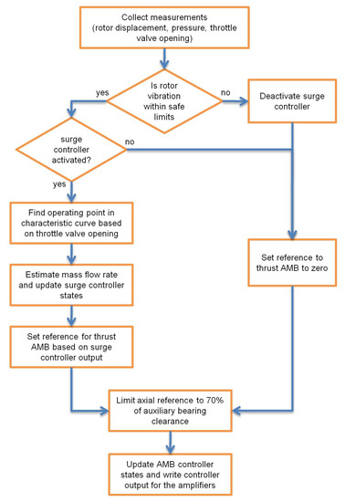 The surge controller will be activated when needed on top of the rotor suspension controllers that are always active throughout the operating period. Since the surge control implementation will be tested at 16,290 rpm, at which the system stores high energy, an accidental contact by improper surge controller implementation can cause more damage to the compressor than the surge instability. Therefore, a safety mechanism for the surge controller activation is required. In our experiments, prior to the surge controller activation, rotor vibration is checked. If rotor vibration is within the predefined limit, the surge controller is engaged in the control process. Then, the reference of the rotor axial position computed by the surge controller is limited to ±70% of the available axial clearance. Otherwise, the reference of the rotor axial position is set to zero for a safe operating environment. The flow chart of the surge controller operation is illustrated in Figure 19.