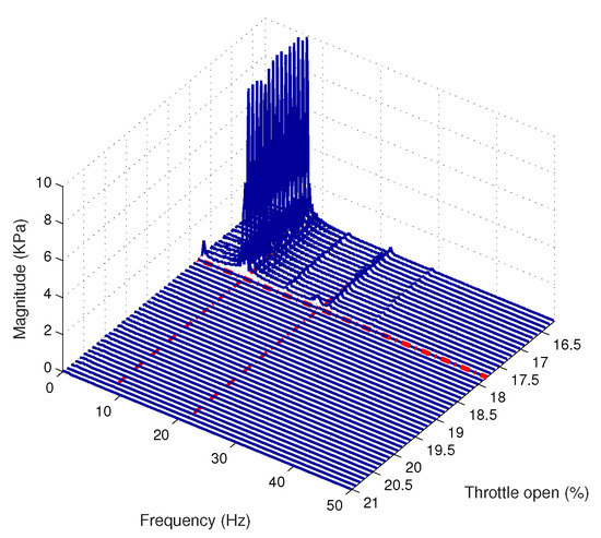 For the case of the FOPD surge controller test, Figure 24 shows the frequency response of the measured plenum pressure rise. It can be noticed that the compression system enters surge when the throttle valve opens at 16.2%, which further extends the surge limit. Recall that the IOPD surge controller remains stable until 17.0% opening.