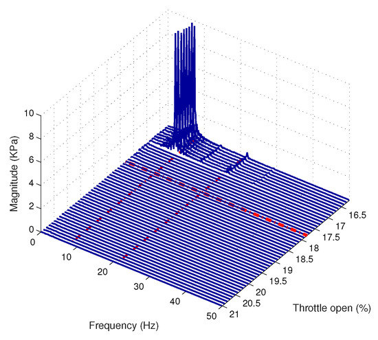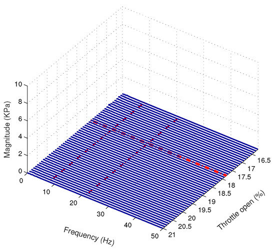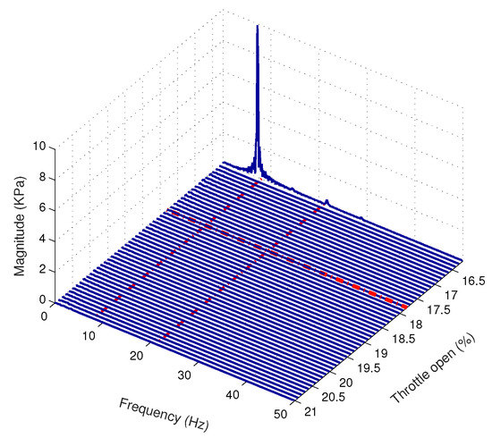 Waterfall plot of the frequency response of the measured plenum pressure signal at 16,290 rpm with the surge controller activated.