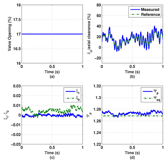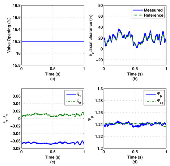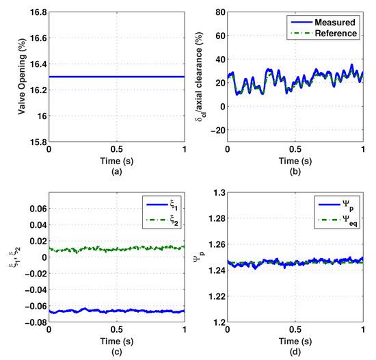 In addition, the maximum value of the impeller tip clearance is about 35% of the available axial clearance, as shown in Figure 29b. This shows that the surge controller can operate stably with approximately the same axial clearance margin as the FOPD surge controller case. Figure 29c shows the values of the surge controller states, and , when the throttle valve is opened at 16.2%. The nondimensional measured pressure rise and its equilibrium values are illustrated in Figure 29d.