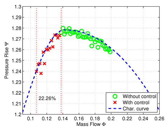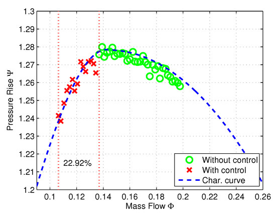 Figure 22 shows the nondimensional mass flow rate and the plenum pressure rise on the characteristic curve during stable operation. The measurements with the surge controller inactivated are marked by ‘o’. These values are measured from 21% valve opening until 17.8%, where the surge initiates. The measurements marked by ‘x’ represent the extended operating points when the IOPD controller is activated. It can be observed that the surge limit is extended in terms of the mass flow range from the uncontrolled case by 11.97%.