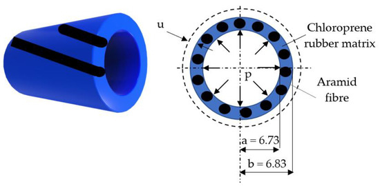 with the following notations: a, b—interior/exterior radii of the undeformed tube, p—compressed air pressure, and E is Young’s Modulus of the tube material (aramid fibres).