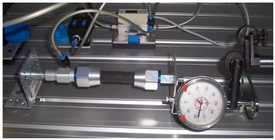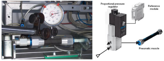 In the second phase of experimental research, the axial displacement of the pneumatic muscle’s free end was measured. Figure 7 shows the experimental set-up used for data collection [34].