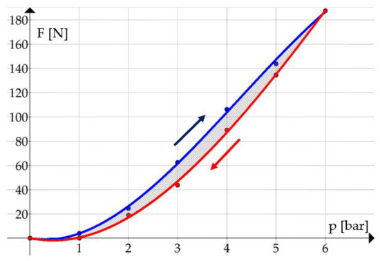In this case as well, it can be noticed that the forces developed by the pneumatic muscles have different values when fed with compressed air at increasing or decreasing pressures, revealing a hysteretic behaviour. The graph shows that the forces developed by the pneumatic muscle are greater when fed compressed air by increasing pressure.