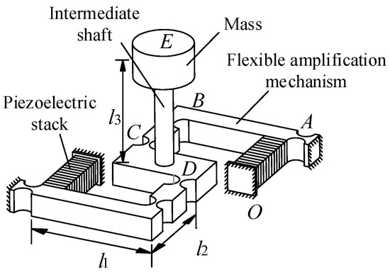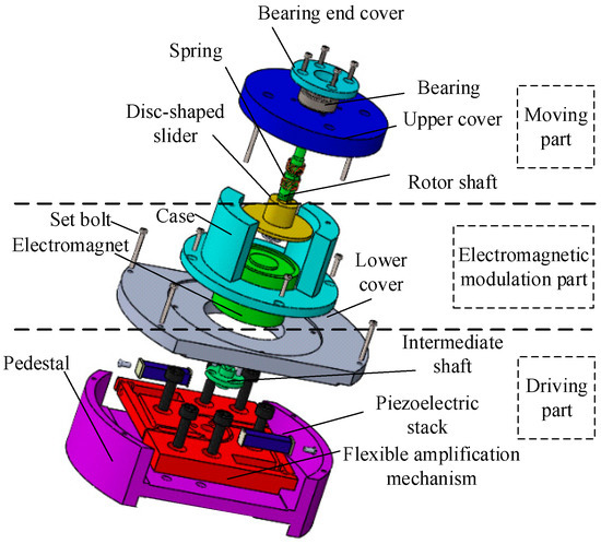 The proposed piezoelectric motor is mainly composed of the driving part, the electromagnetic modulation part and the moving part. The driving part includes two piezoelectric stacks, a flexible amplifying mechanism and an intermediate shaft. The electromagnetic modulation part includes an electromagnet, a disc-shaped slider, and a spring. The rotor shaft and a bearing belong to the moving part of the motor, as shown in Figure 1.