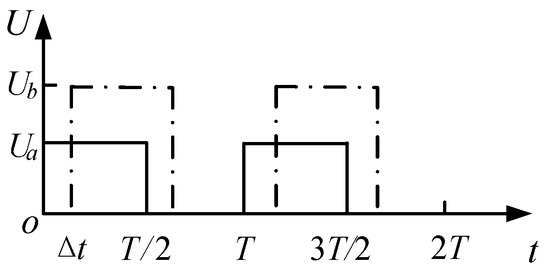 In the working step, the electromagnet attracts the disc-shaped slider and then rotates with the driving part. Considering that it takes a certain time for the disc-shaped slider to be attracted down after the electromagnet is energized, the piezoelectric stacks and the electromagnetic modulation mechanism are driven by two square wave signals with the same frequency but different phases separately. From Figure 2, Ua is the peak value of the driving voltage for the electromagnetic modulation part, while Ub is the peak value of the driving voltage for the piezoelectric stacks, T is one cycle of the motor operation, and Δt is the driving time difference of the two driving signals. This type of piezoelectric motor will present a stepping rotary motion, as shown in Figure 3.