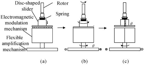 • When the high level of the driving signal Ua disappears, as shown in Figure 2, the disc-shaped slider would be separated from the electromagnet under the action of the spring force. After another period of time Δt, the driving signal Ub of the piezoelectric stacks is at low level. Then, two piezoelectric stacks restore to their original length and the electromagnetic modulation part returns to its original position with the elastic restoring force of the flexible amplifying mechanism, so the rotor rotates an angle θ relative to the electromagnet, as shown in Figure 3c. The time different Δt of each cycle of two driving signals prevents that the rotor shaft reverses due to inertia when the disc-shaped slider is separated from the electromagnet. Repeating the above steps can achieve continuous step rotation of the motor.