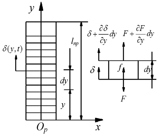 The piezoelectric stack elongates or recovers in the axial direction under signal excitation, so it can be simplified into a continuous system of axial vibration. The piezoelectric stack dynamics model is shown in Figure 5, in which δ (y, t) is the axial displacement equation of the piezoelectric stack, F is the axial internal force between the piezoelectric sheets, and f is the axial distribution force. Let the density of the piezoelectric material be ρp (y), the elastic modulus is Ep (y) = c33, and the cross-sectional area is Ap.