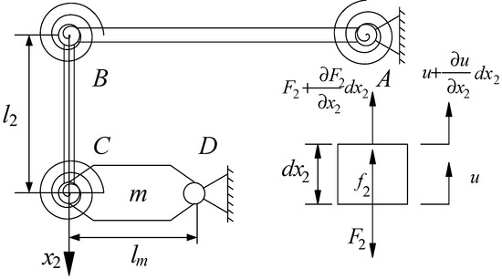 Point B is set as origin of a relative coordinate system, and x2 axis is along the length direction of beam BC. As shown in Figure 7, F2 is the axial internal force acting on the beam cross section, f2 is the axial distribution force, lm is the length of the beam CD. Let the longitudinal vibration displacement of beam BC is u (x2, t).