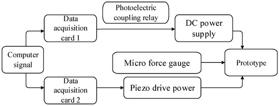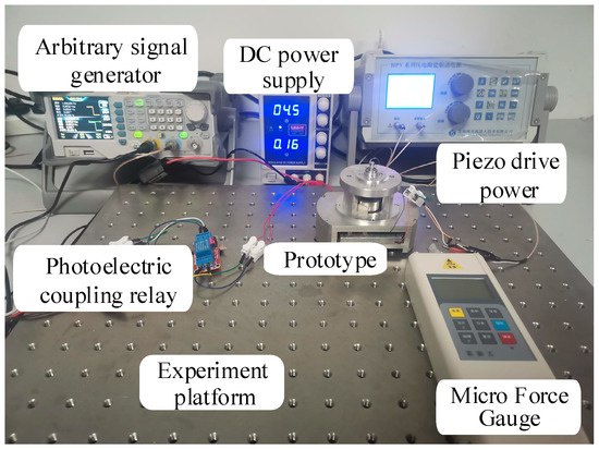 For the measuring output characteristics of the piezoelectric motor, another test system was established, which mainly included the computer, NI USB-6009 data acquisition card (Shenzhen Boruitu Electronic Technology Co., Ltd., Shenzhen, China), HPV piezo drive power (Suzhou Boshi Robotics Technology Co., Ltd., Suzhou, China), prototype, UNI-T direct current (DC) power supply (Unitech (China) Co., Ltd., Dongguan, China) and HP-5 micro force gauge (Yueqing Aidebao Instrument Co., Ltd., Yueqing, China ). Figure 16 shows the flow chart of the output characteristic test system. Figure 17 shows the experimental environment for measuring output characteristics.