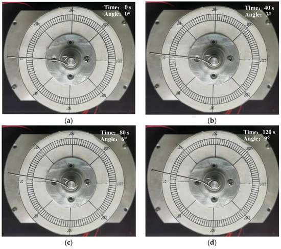 Figure 18. Experimental effect when the phase difference α is 50°. (a) At 0 s; (b) at 40 s; (c) at 80 s; (d) at 120 s.