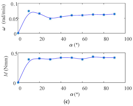 In the test, the adjustment range of the drive voltage peak of the electromagnetic modulation mechanism was 3.5–5 V, the adjustment range of the drive signals frequency of the electromagnetic modulation mechanism and the piezoelectric stacks were 1–5 Hz, and adjustment range of the phase difference α between the electromagnetic modulation signal and the piezoelectric drive signal was 0–90°. In the speed measurement, the time of the prototype rotating a certain angle was recorded. Multiple measurements for speed were repeated to record the data, and the average speed of the prototype can be calculated. In the prototype torque measurement, a metal rod was mounted horizontally on the rotor shaft, and the thrust of the metal rod was measured with a micro force gauge. The micro force gauge could display the thrust of the metal rod test point, and the output torque could be calculated by the thrust. When the phase difference α was 50°, we investigated the operating status of the motor, as shown in Figure 18. The motor rotated about 9° in 120 s. This kind of motor presents a slow running state, from the measurement results.