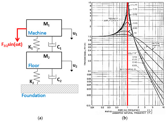When the machine is rigidly restrained on the floor (K1→∞), the mathematical model in Figure 2a reduces to a single DOF that transfers all the vibration source and machinery power to the structure. Depending on the damping and frequency properties of the involved systems, see Figure 2b, the machine–structure frequency ratio should be possibly limited to a maximum of 0.5, or to a value higher than 1.3, in order to minimize the dynamic amplification phenomena.
