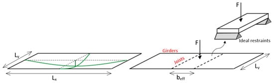 To properly assess such a dynamic issue, knowledge is thus basically required on the side of the machine (i.e., for its reliable characterization under operating or non-operating conditions) but also on the side of the floor/structure object of study, that should be properly described. In this case, the efficiency maximization of FE tools should be supported by reliable schematization approaches. Large floors under static loads (i.e., Figure 3) are for example commonly analyzed on the base of a given efficient width beff that captures the behavior of the structure. Among others, one of its conventional definitions takes the form of