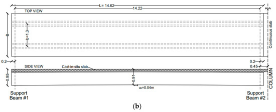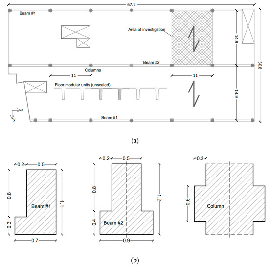 The two-story, two-span, precast concrete is characterized by 13 m of elevation, with plan dimensions of Lx = 67.1 × Ly = 30.8 m and an aspect ratio α = Lx/Ly = 2.17 (Figure 5). The grid of beams and columns schematized in Figure 5 detects 6 × 2 adjacent bays (with lx = 11 × ly = 14.9 m, α = 0.74, for each one of them). Based on earlier observations and client requirements, the research study was focused on the single-span region in evidence. The structural concept, more in detail, includes a series of plinth-restrained, square columns (80 × 80 cm the cross-section) and prestressed, precast beams, that are used in the x direction to support the inter-story floor (+8 m from the foundation) and the wing-shaped members of the roof (+13 m from the foundation). All the beams have cross-section features that agree with Figure 5b, and cover a total span of 10.25 m, with 0.2 m the width of cantilever supports that are offered by the columns.