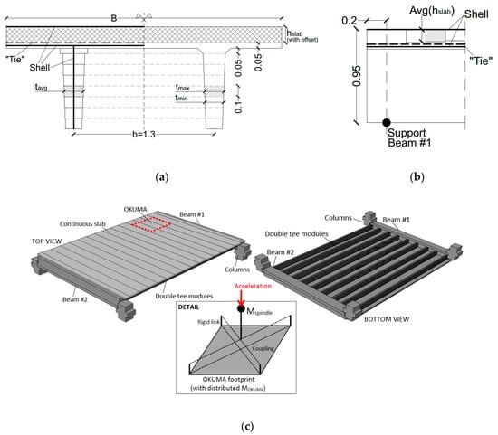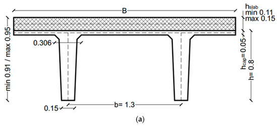 The floor schematized in Figure 5a consists of a series of adjacent, unconnected double tee modular units and a continuous, cast-in-situ concrete slab on their top, that ensures the structural continuity and a certain flexural/torsional rigidity for the diaphragm. Depending on their final position, the double tee elements have cross-section features that agree with Figure 6. The nominal height is set in h = 0.8 m, while the width B is generally equal to 2.34 m, 2.50 m or 2.55 m. The distance of the webs (b = 1.3 m) and the thickness of the top cap (hcap = 0.05 m) are kept fix.