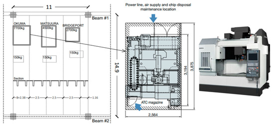 Plan view of the CNC machines on the floor region object of study (nominal dimensions in m), with details of the OKUMA machinery center.
