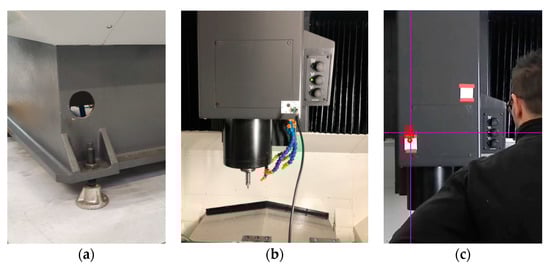 OKUMA machinery center: (a) detail of the typical base restraint (foundation washer) and (b) its spindle (in evidence, the mp#1 accelerometer), with (c) example of video-tracking acquisition of the vertical displacements.