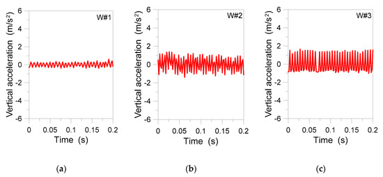 Experimental records of the spindle vertical acceleration from three different working activities of the OKUMA machinery center (mp#1): (a) W#1, (b) W#2, and (c) W#3.