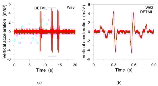 From the detailed analysis of each process, more in detail, some irregularities were occasionally observed for the W#3 program. This resulted in severe acceleration peaks that are proposed in Figure 10. In any case, their frequency content and number of repetitions was associated to secondary effects for the primary structure.