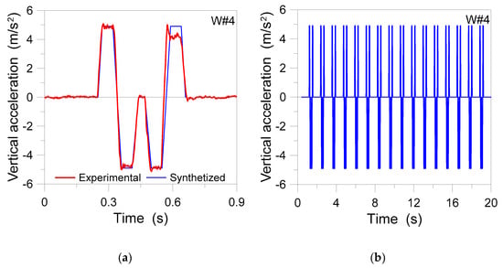 Among the available programs of the OKUMA center, the worst condition for the inter-story floor and the factory as a whole was in fact detected in the W#4 process, whose acceleration history is shown in Figure 11a. Compared to Figure 9, as shown, the W#4 process typically resulted in acceleration peaks in the order of 5 m/s2, with a frequency of 0.9 Hz. Given the severity of these accelerations and the general discomfort for the building occupants, moreover, the W#4 experimental characterization was based on acceleration records based on a limited number of cycles for each test repetition (eight in total). Figure 11b shows the synthetized signal that was experimentally derived to describe a possible continuous activity of the OKUMA.