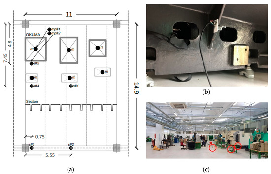 Reference setup for the field dynamic experiments: (a) plan view, with dimensions in m; (b) detail of mp#2 (base of the machine frame); and (c) global view of the examined floor region (in evidence with red circles, the position of sensors s#4, s#5, and mp#2).