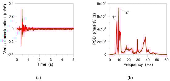 Figure 13 shows the typical floor response under the W#0 condition. From Figure 13b, it is possible to detect the two low fundamental natural frequencies of the floor, in the order of f1,exp = 7.4 Hz and f2,exp = 9.4 Hz respectively. Higher vibration frequencies can be also perceived in the range from ≈12 Hz to ≈40 Hz.