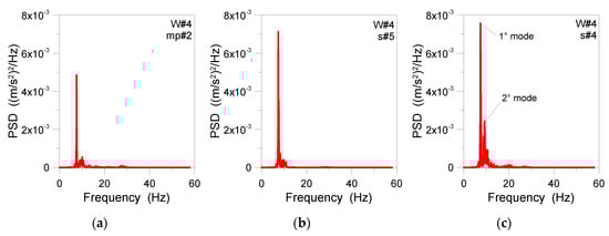 Experimental PSD for the examined floor region (W#4), as obtained from (a) mp#2 (base of the machine frame), (b) s#5 (floor), and (c) s#4 records (floor mid-span). In evidence, a selection of 5 s of acquisition.