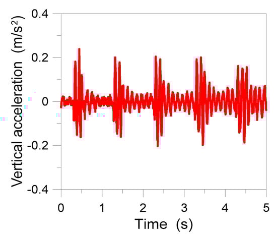 The maximum resonance effects, in this regard, were generally measured in the mid-span region of the slab, rather than in the machinery region. The corresponding vertical accelerations are proposed in Figure 15, with evidence of 5 s of acquisitions for the W#4 process. For the s#4 control point in Figure 15, the effects of continuous machinery cycles can be perceived in vertical acceleration peaks in the order of 0.26 m/s2.