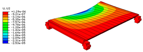 As far as the complexity and detailing of the FE assembly increases, the rather close correlation for the fundamental mode predictions can be noticed in Table 5. On the other side, a number of additional vibration modes can be also noticed for the 2 × 2-bay model, given that the stiffened plate bending deformation of the floor as a whole can separately affect single bays of the diaphragm. In this research study, for example, it was proved that the intermediate frequencies in Table 5 are still associated with global bending deformations for the examined inter-story floor, but with negligible vertical displacements for the region object of study. The vibration shapes in Figure 19, finally, further confirm the good correlation of the one-bay and 2 × 2-bay models, with regard to the floor region of interest. As such, the one-bay assembly was still found reliable for the purpose of this investigation.