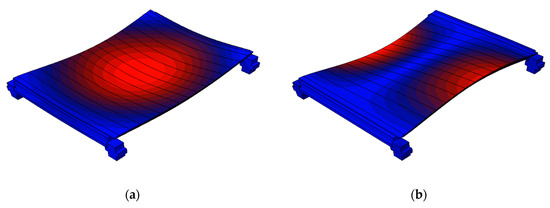 Numerical vibration modes of the inter-story floor region with all the CNC machines at rest (ABAQUS ‘frequency’ analysis, one-bay FE model). (a) f1 = 7.37 Hz. (b) f2 = 9.41 Hz